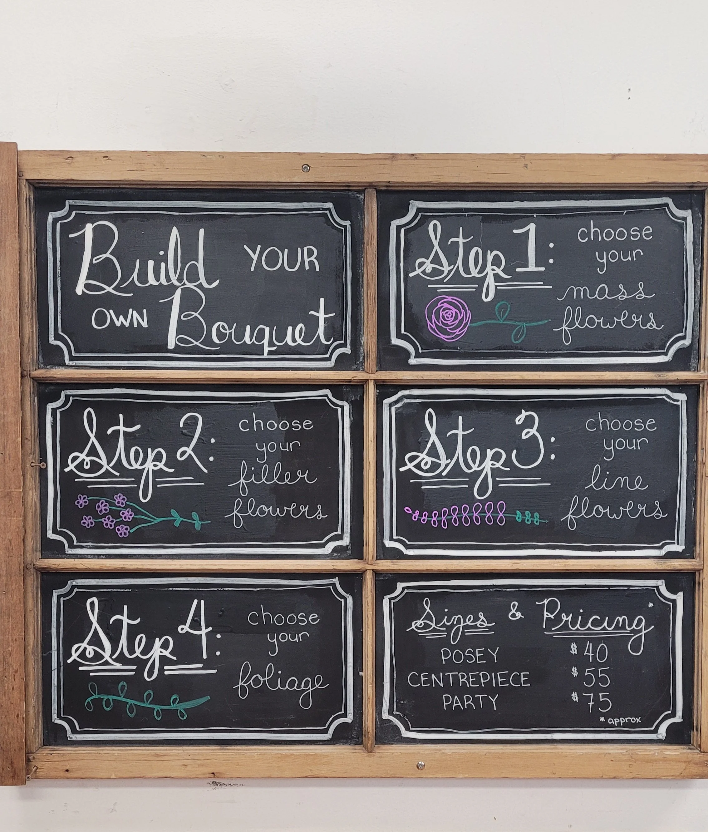 Unlike any other florist in town, at Kate’s Garden we have a pick-bar approach. This means that you can select blooms and foliage from our coolers at any time and, guided by our Fleuristas, build your own bouquet. You will be sent home with the bouquet carefully packaged to ensure longevity. Please see below for the basic ingredients, prices and sizes.