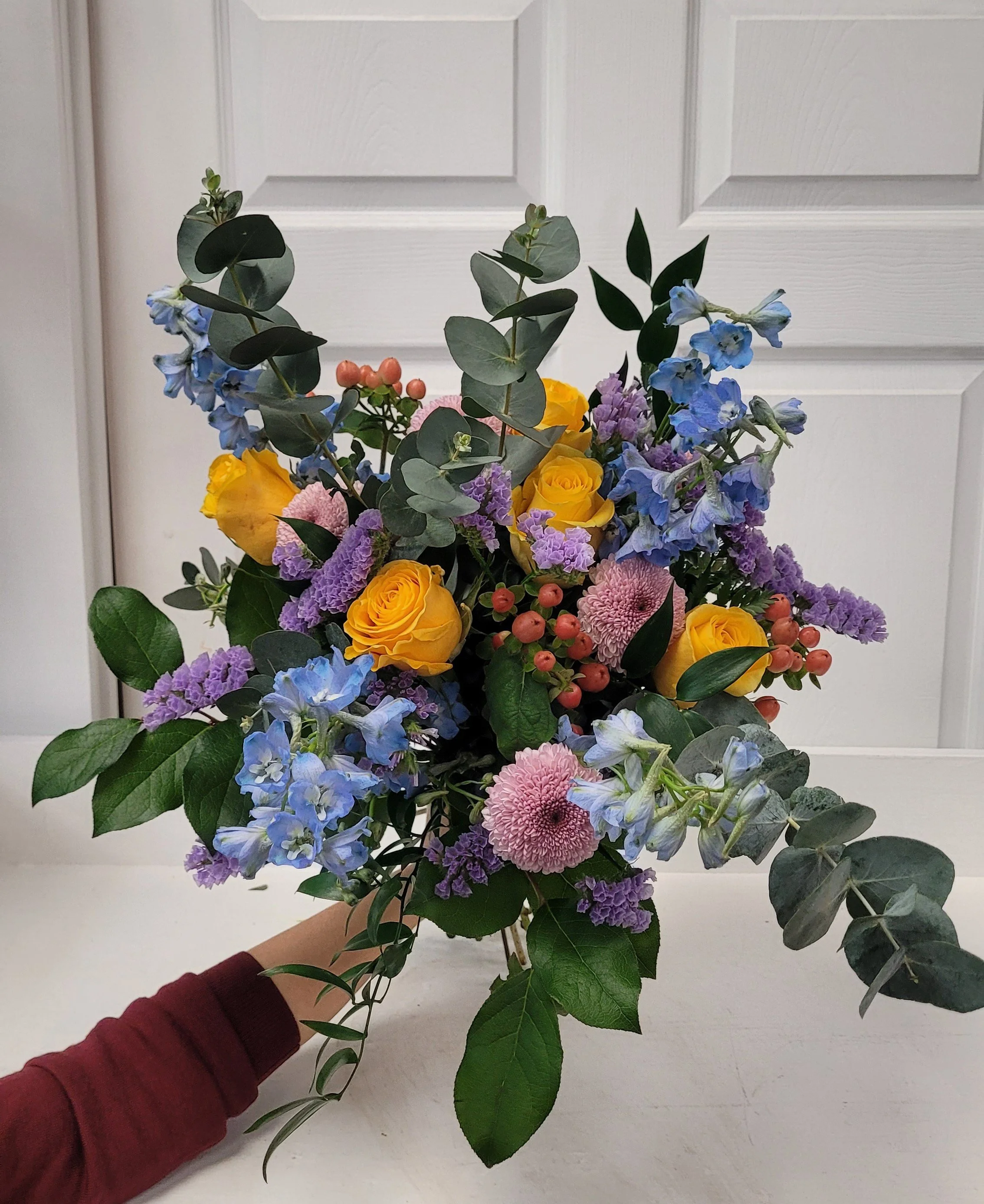 We change the bouquet style every month, using a variety of techniques including spiraling, hand-tying, gridding, bundled and foraged. We change the colours to match the season with an emphasis on premium and select flowers. The picture above is an example of a Dining Room bouquet for the month of April.